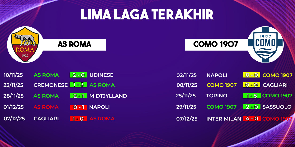 Jika melihat rekor head to head, Roma dan Como menunjukkan keseimbangan yang cukup menarik. Dalam empat pertemuan terakhir, kedua tim saling mengalahkan, menandakan bahwa duel ini kerap berjalan ketat dan sulit diprediksi.