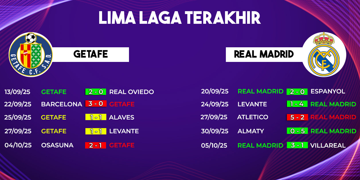 Jika menilik catatan head-to-head, Real Madrid begitu dominan atas Getafe. Dari 40 pertemuan terakhir, Los Blancos mencatat 30 kemenangan, sementara Getafe hanya mampu menahan imbang beberapa kali dan belum pernah menang dalam tujuh laga terakhir melawan Madrid.
