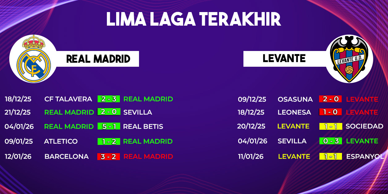 Real Madrid berada dalam tekanan besar, sementara Levante datang membawa kepercayaan diri yang perlahan tumbuh. Pertemuan ini berpotensi menghadirkan pertandingan terbuka dengan tensi tinggi, terutama melihat situasi internal Los Blancos yang belum sepenuhnya stabil.